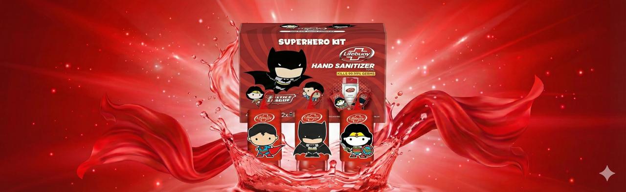 Amid the COVID-19 pandemic, Lifebuoy launched an innovative promotional campaign to encourage hand sanitizer use among its target audience. To add excitement and appeal, Lifebuoy collaborated with licensed superhero characters to create a special “Superhero Kit.” This kit included four 50ml hand sanitizers featuring popular Justice League characters, making hygiene fun and engaging for children and families.